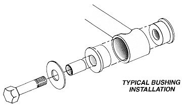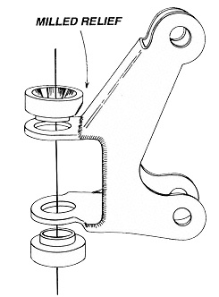 | D. C. series axle brackets utilize slip-in tapered buttons to accept spring perch. These buttons are simply slipped into place as shown when installing the bracket onto the axle. The top button has a milled relief on one side to clear the weld on the bracket Be sure to position this button correctly to insure that it seats flat when installed. | ||