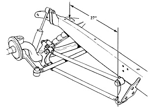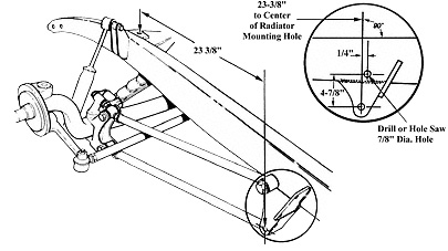 | We recommend that you box your frame from the front crossmember to the firewall. If this can't be done, box a section that extends at least 4 inches on either side of the 4-link frame bracket Once the frame is boxed, tack weld or clamp driver side frame bracket (bracket with steering plate if Mustang type steering is being used) to bottom edge of frame, flush with side of frame at position indicated by the print at right which applies to your car Repeat procedure for passenger side bracket To locate hole for top bar on '32- '34's, use measurement shown on print at right. Bore or hole saw a 7/8" hole in frame (NOTE.- ECONO KITS NEED A 3/4" HOLE) and weld in frame bushing. Bolt bars to brackets and upper mounting hole in frame with adjustable ends toward front, with front end partially assembled. Check front end for square before final welding. After welding, finish grind weld on side of frame for clean appearance. |
