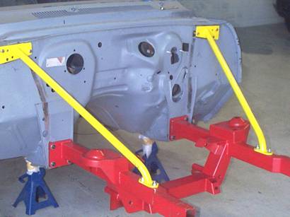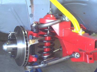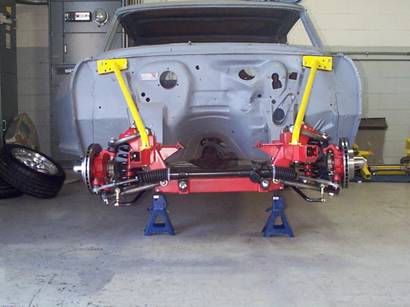 62-67 CHEVY NOVA MUSTANG II Read and understand these instructions before starting any work!! SUPPORT VEHICLE WITH JACK-STAND, BEFORE DOING ANY WORK !! 1. Begin installation by jacking the car up and supporting it on sturdy jack stands. The stands must be located just behind the firewall on the flat side. Do not support the car from the front sub-frame. First, remove the hood and hood hinges. Remove the front wheels and disconnect the wiring to the front components such as the headlights, turn signals and parking lights, etc. Remove the front bumper and brackets, front fenders and grill. Be certain to retain all these bolts, as they will be reused when these parts are reinstalled. Next remove the core support and radiator. Next remove the engine and transmission. Now unbolt and remove the factory sub-frame with the inner fender panels. Next remove the old steering box and the steering column. The original steering column can be re-used with the new rack and pinion suspension with a little modification to the column. The original steering box will not be used. This is a good time to give the firewall a good cleaning and detailing, as there should be nothing more attached to it. 2. Start the installation of the new sub-frame by raising it up into place in front of the firewall. A floor-jack will help here. Line up the holes to the holes in the firewall and bolt it on using the new bolts and lock nuts. Tighten up the bolts. Next install the upper firewall support tubes from the front rails to the mounting surfaces on the firewall, using the original inner fender panel bolts. If there is a gap here, you can install some of the shims now, or bolt it tight and wait until the fenders are reinstalled. To determine the correct shims for the final sheet metal alignment. 3. Re-install the engine and transmission back into the vehicle. The weight of the engine will be helpful in compressing the springs while the installation of the suspension components. The factory engine mounts should line up to the stands on the sub-frame. Check the oil pan clearance, (rear sump oil pan must be used) 4. Continue with the suspension component installation. Install the upper and lower control arm. Place the coil springs up into the spring pockets and bring the lower arms up to them. Install the shocks by placing the first washer and rubber mount on the shock stud and sliding them up through the lower arms and shocks. Using a floor jack under the lower ball joint (if using a floor jack make sure lower control arm grease fitting will clear the floor jack cup) (Another option is to use an external spring compressor), compress the springs by raising the lower control arm up into position. The shocks are the “top-out” device and will hold the coil springs in place. As the lower control arm are raised, attach the upper rubber mount, washer and nut on top of the shocks when they come through the upper shock mount cups. Install the spindle assembly onto the lower ball joints and then install the upper ball joints into them. Now install the rack & pinion assembly using the two 5/8” in. bolts, washers and lock nuts supplied. Install the tie rod ends onto the rack and into the spindle arms. Estimate the alignment at this point. It is a good time to install the steering column and headers now, as it is easier to work on the steering column connection to the rack & pinion before the sheet panel is in place. 5. Finish up by installing the core support and radiator. Next install the grill & front fenders. You may have to adjust the shims at the upper mounts to align the front fender gap at the doors. Install the front wheels and place the car on the ground. The springs will need a little time to settle-out, before you get the proper ride height. The lower control arms should be level. If the car is too high, you may have to cut some off the springs. Cut only a quarter of a coil at a time & check the height again. Align the front suspension to the following specification: Caster 7/88 63/48 Camber 3/4861/28 Toe-In 1/8”61/8” with Manual steering: Caster-1.0 Camber-0 Toe-In - 1/16 with power steering: Caster- 4 Camber - 0 Toe-In - 1/16